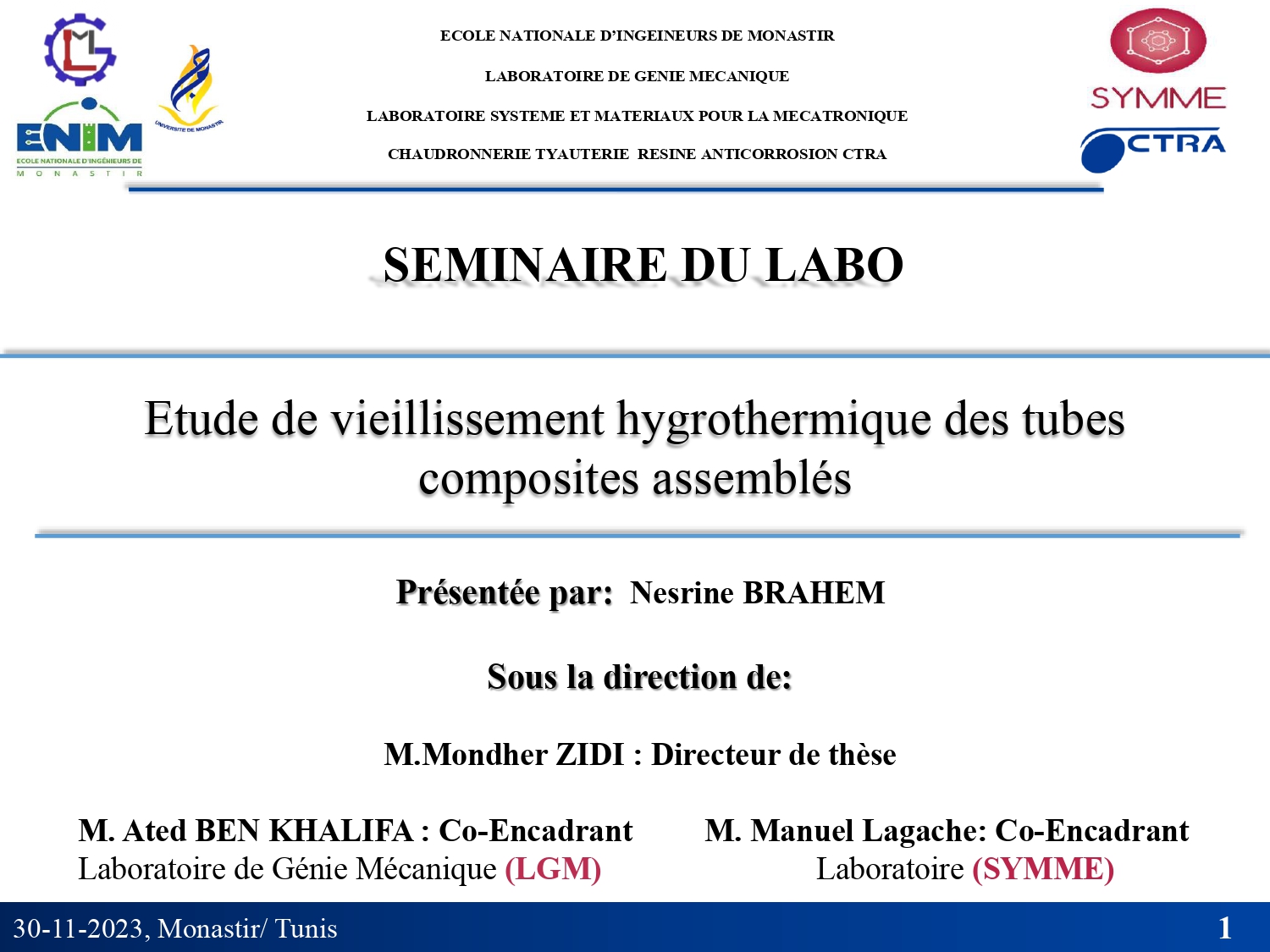 La doctorante Nesrine Brahem va présenter une partie de ses travaux de recherches intitulée: " Etude de vieillissement hygrothermique des tubes composites assemblés ".